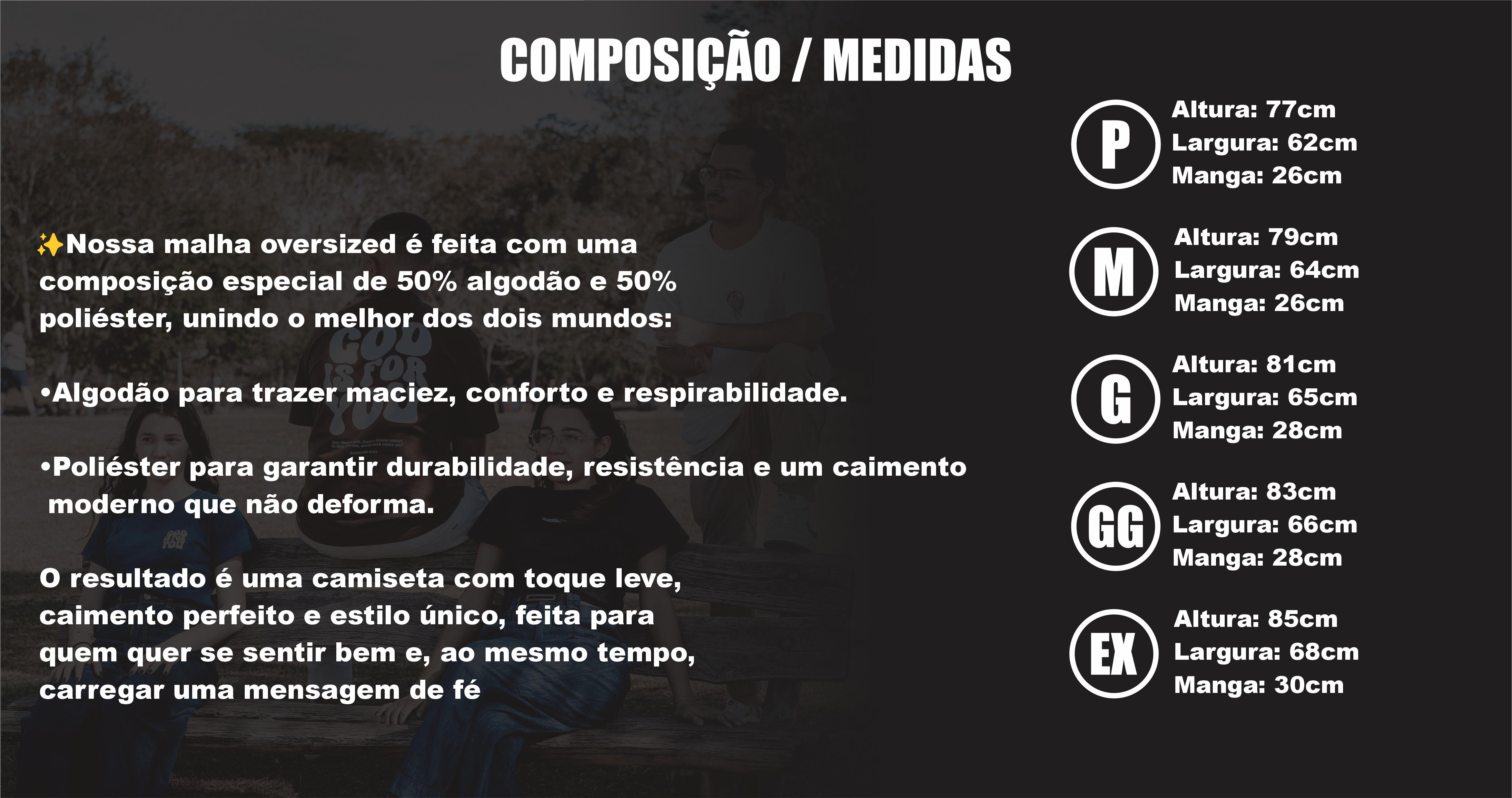 Modelo Oversized: tecido premium com caimento mais largo, feito com 50% algodão + 50% poliéster.